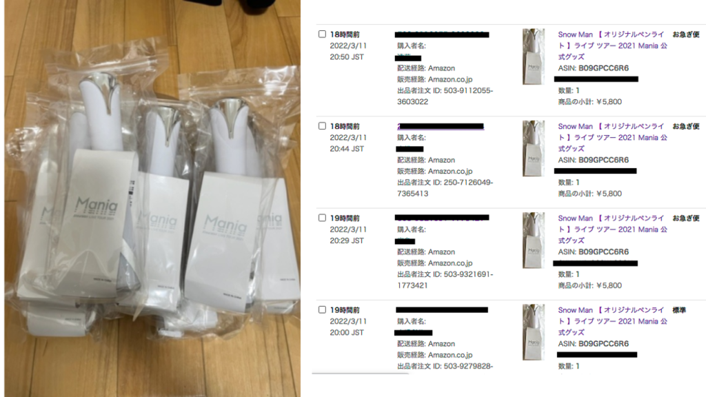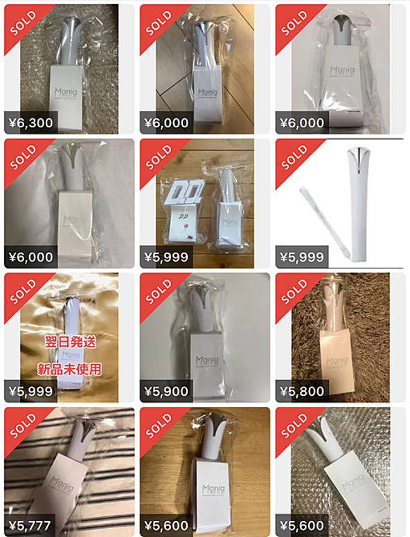 例えばこのSnowManのツアーペンライトですが定価1,800円→5,800円で数十分おきにバコバコ売れています。ツアーのペンライトなのでツアー開催前にものすごい需要があり爆発的に売れます。
