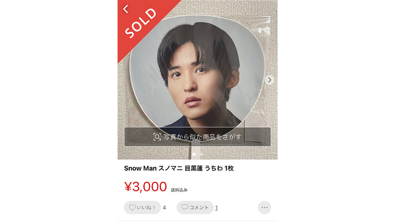 例えば、このSnowManというグループの目黒蓮くんのうちわがメルカリで3,000円で売れましたがこのうちわの定価は600円です。その他もジャニーズグッズは数百円〜数千円で購入できるので小資金から始められます。
