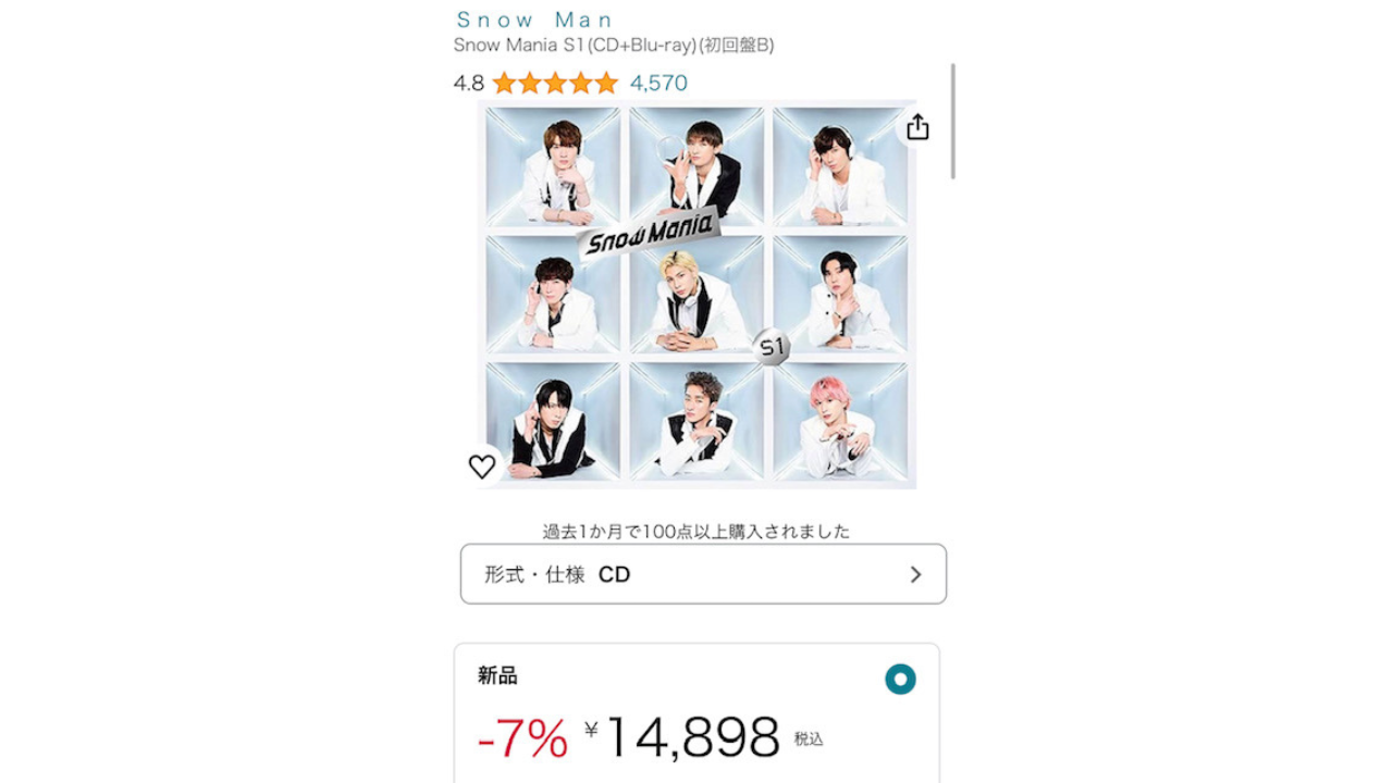例えばこのSnowMan「S1」初回限定盤は仕入れ値3,481円→6ヶ月後には10,000円越えです。