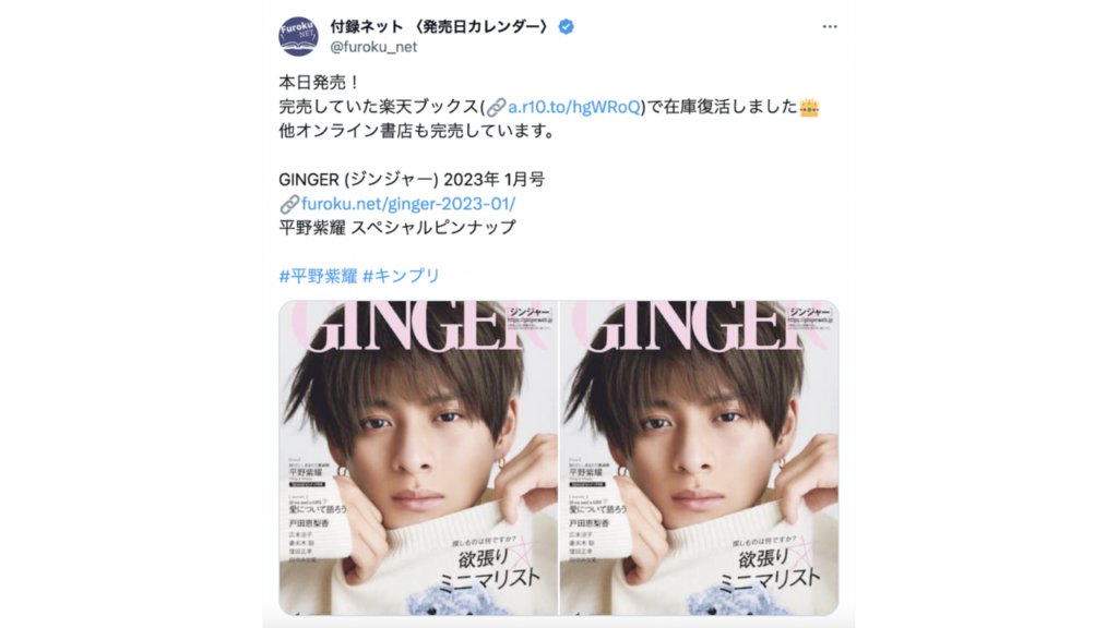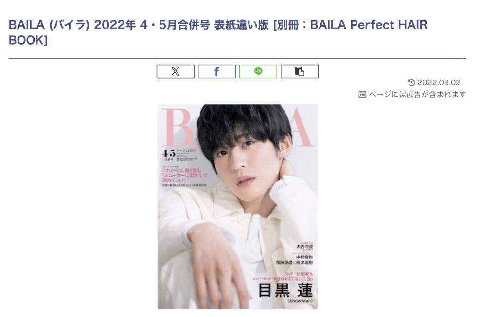 BAILA初の発売前重版が決まった目黒蓮表紙の4・5月合併号の情報をTwitter上で誰よりも早く発信したのが付録ネットです。