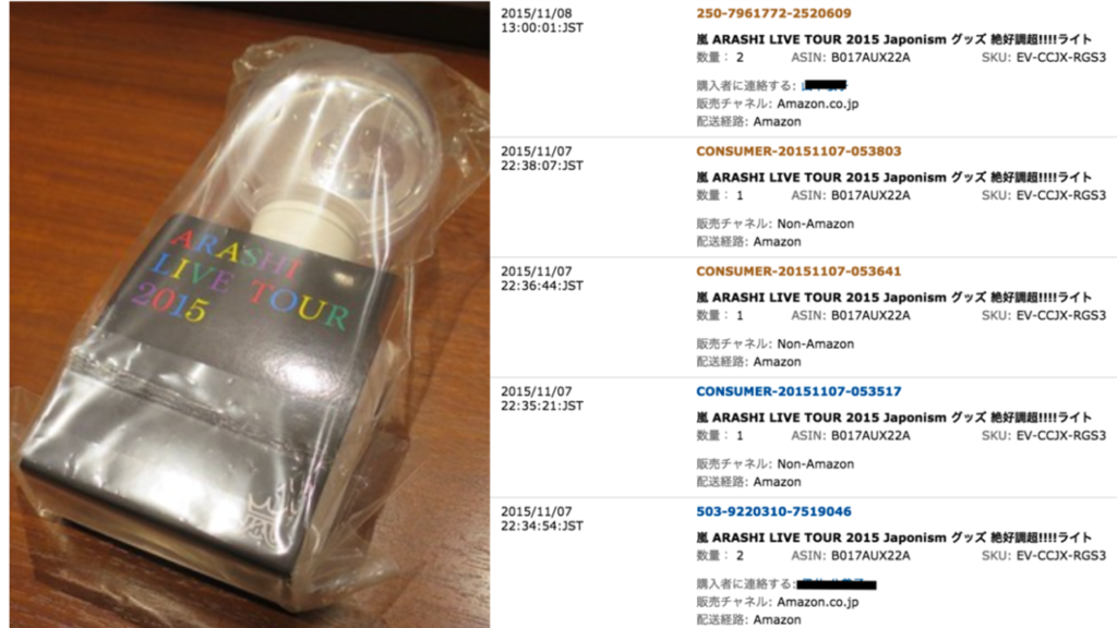 これは↓↓当時人気だった嵐のツアーグッズですが画像は商品の一部ですが大量に仕入れていて1つのツアーだけで粗利300万円とか稼いでました。