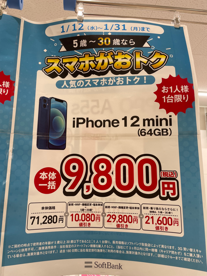 こちらのPOPを見てみると【iPhone12 mini 64GB】が【一括9,800円】と書かれています。