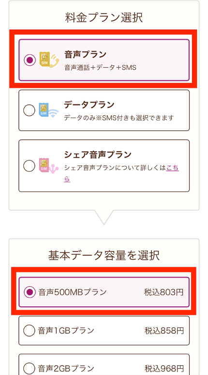 料金プランは必ず「音声プラン」を選択してください。また、基本データー容量は一番安い「音声500MBプラン」で大丈夫です。