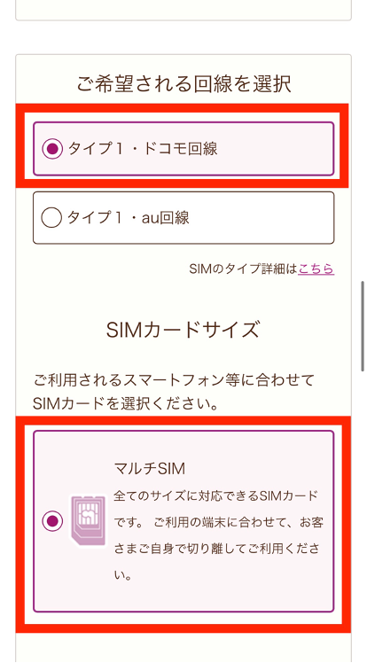 回線は「ドコモ回線」か「au回線」を選択するのですが、乗り換え先がドコモならau回線、乗り換え先がauならドコモ回線を選択してください。
