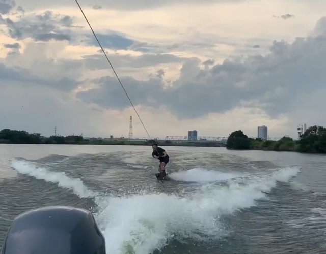 ウェイクボードは、モーターボートに引っ張られながら水上を滑るスポーツです。